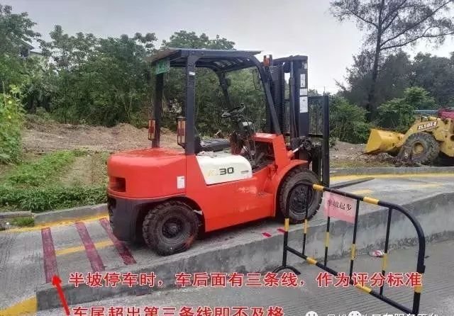 半坡起步:車上右手邊有一紅色箭頭,半坡停車時,車上箭頭要對準場地邊上的指定區域(紅線標注的);稍作停頓即可,起步時,左腳放離合要慢,右腳同步加大油門,注意同步操作,便于起步。